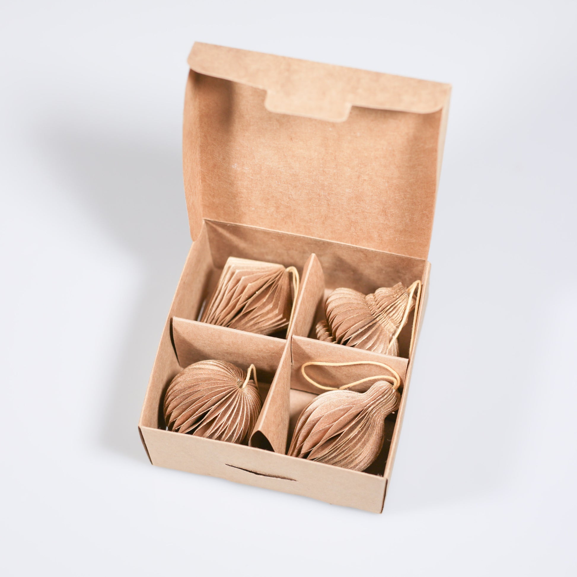 Ce coffret contient 4 décorations de Noël à suspendre, aux formes variées, délicatement conçues en papier recyclé.